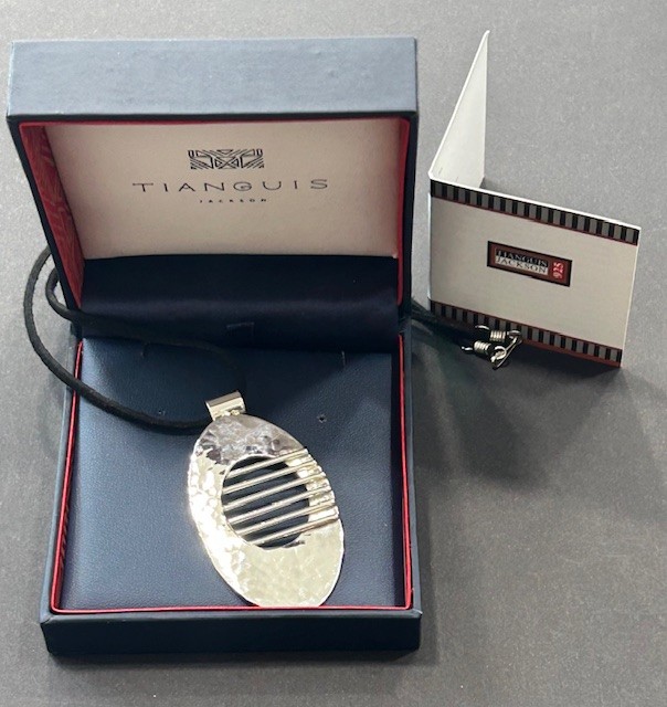 Our “Andrea” sterling silver statement pendant has been designed and crafted for the jewellery brand Tianguis Jackson. This substantial and heavyweight piece is everything you would expect from this quality brand. The pendant features hammered sterling silver and polished bar detailing. The pendant measures 63 mm in length and comes complete on an 18″ black suede thong necklace, finished with silver findings, making for a different look, but this can be changed to a more traditional silver chain if that is the look you prefer. The necklace will arrive presented in a Jangles branded gift box.
