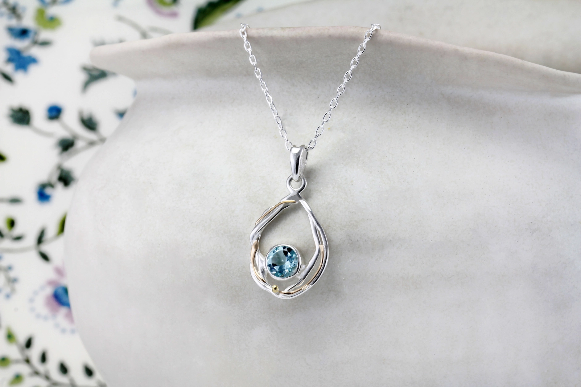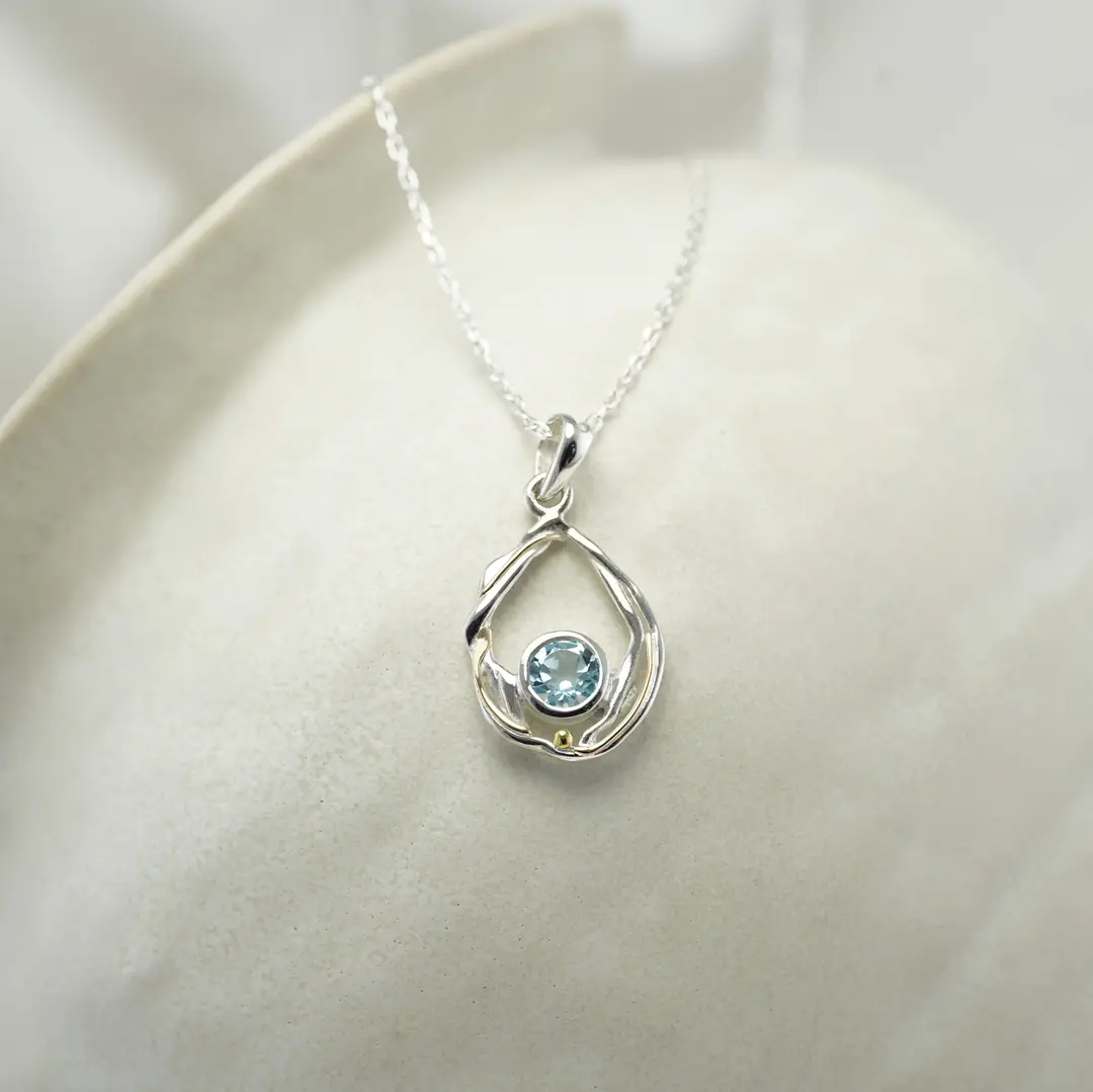 Our ‘Ava’ pendant, features a stunning faceted blue topaz, set in a teardrop of open-work, undulating sterling silver, which is entwined with 14KT gold fill detailing. The pendant has a 27mm drop and is 16mm wide. The pendant comes complete on an 18″ (46 cm) sterling silver chain .