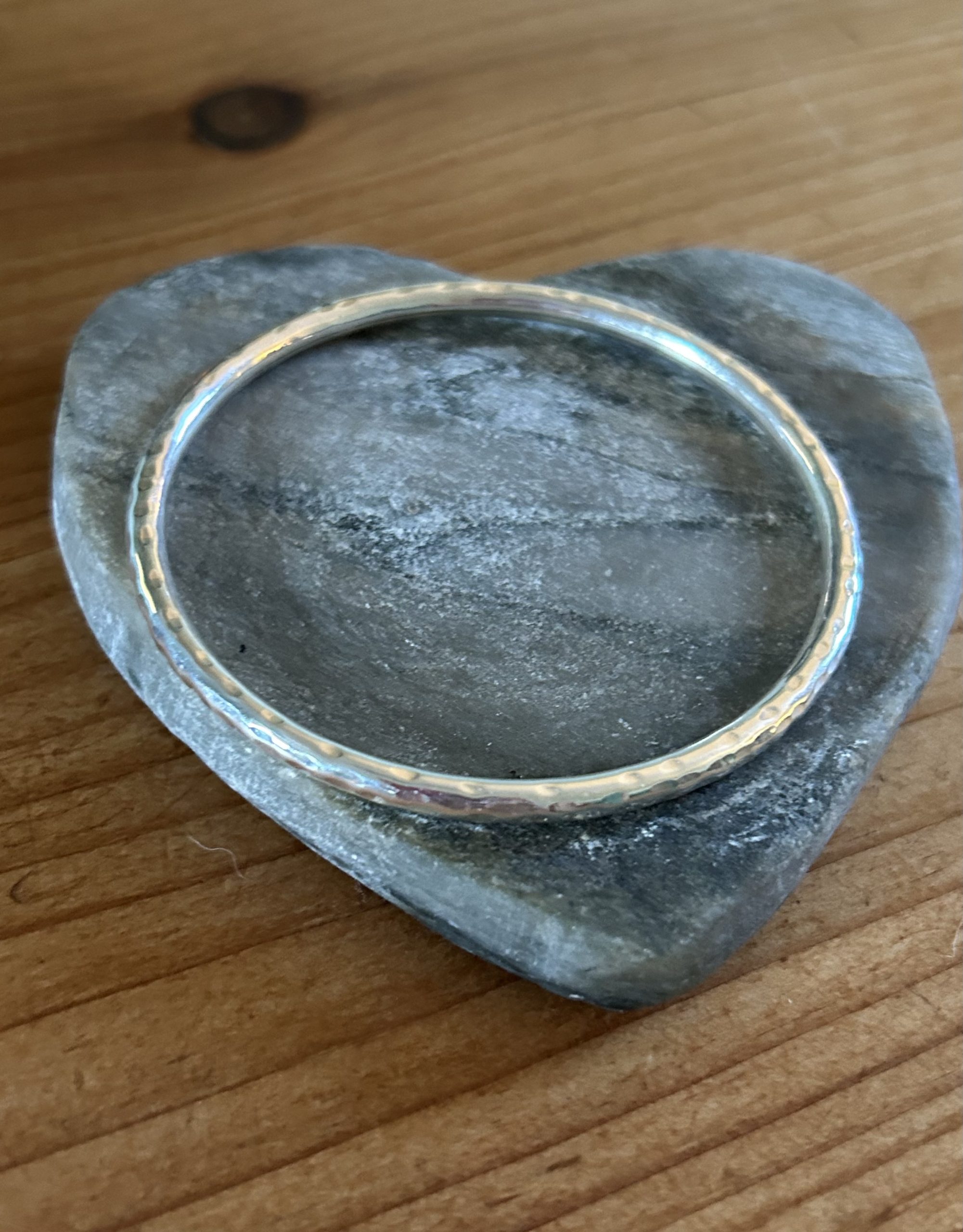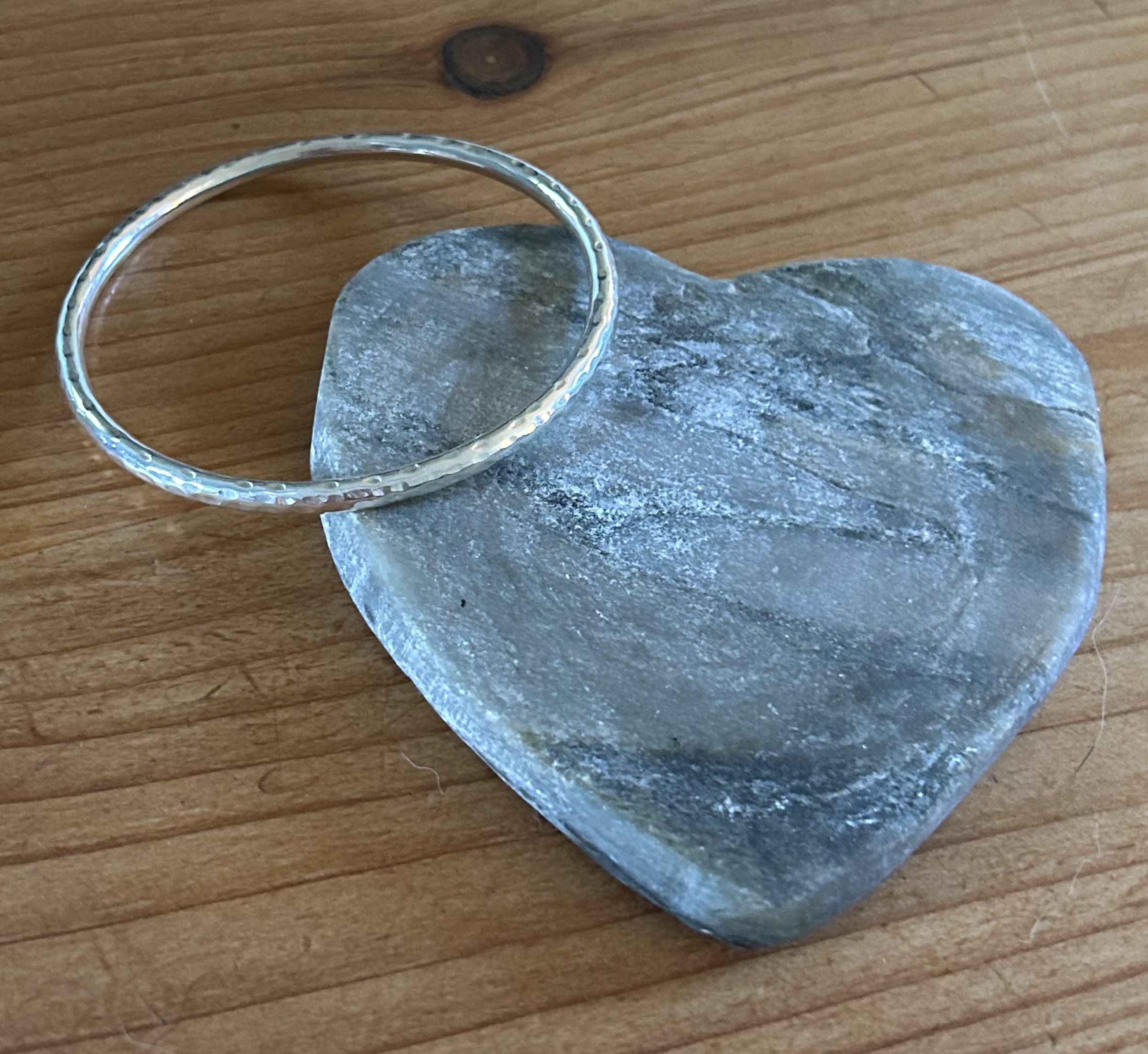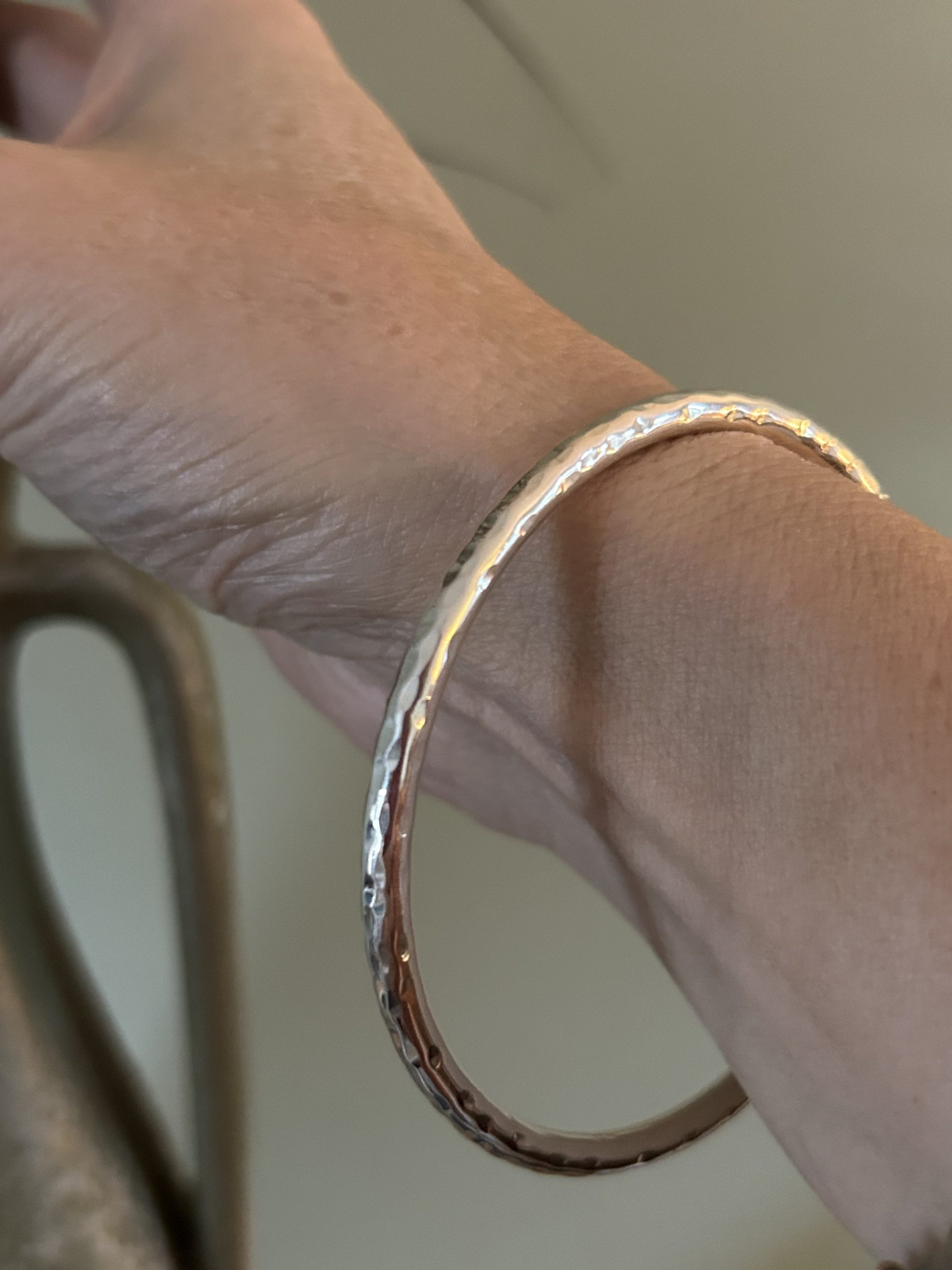 Hammered sterling silver tubular shaped bangle. This is a beautifully made, weightier, bangle and perfect for every day wear.The bangle will arrive presented in a Jangles branded gift box.