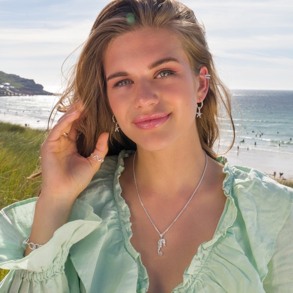 This beautifully crafted, sterling silver, pendant features the distinctive design of a seahorse. Created by Cornish jewellery designers who take their inspiration from the organic forms of the coast, this pendant will brighten up any outfit. The pendant is a beautiful, weighty piece, and is detailed to both front and back. The pendant measures approximately 34 mm, including the bail and comes complete on an 18″ (46cm) long sterling silver trace chain.