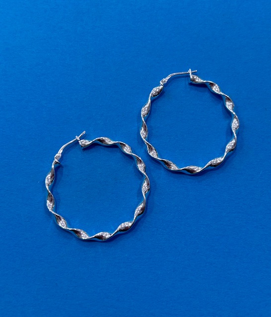 Sterling silver, lightweight, twisted top-hinged hoop with creole fitting. The earrings measure 36 mm in diameter. The hoops will arrive presented in Jangles branded gift packaging.